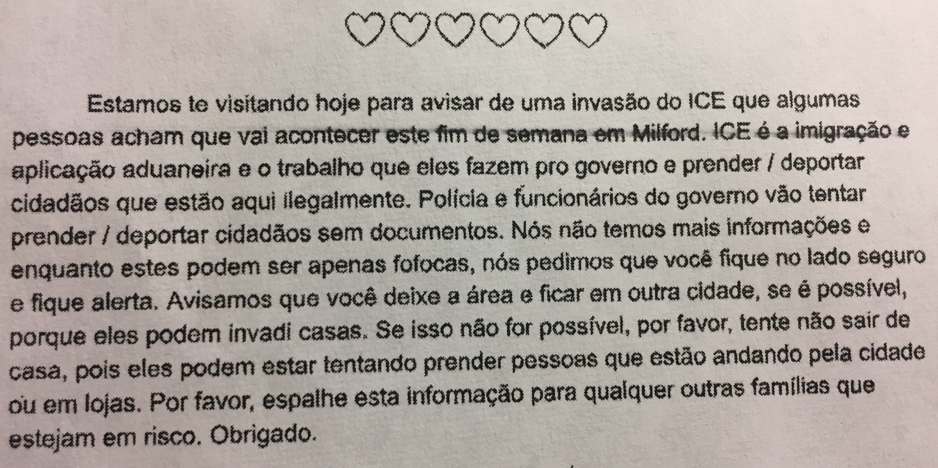 “Estamos te visitando hoje para avisar de uma invasão do ICE que algumas pessoas acham que vai acontecer este fim de semana em Milford. ICE é a imigração e aplicação aduaneira e o trabalho que eles fazem pro governo e prender / deportar cidadãos que estão aqui ilegalmente. Polícia e funcionários do governo vão tentar prender / deportar cidadãos sem documentos. Nós não temos mais informações e enquanto estes podem ser apenas fofocas, nós pedimos que você fique no lado seguro e fique alerta. Avisamos que você deixe a área e ficar em outra cidade, se é possível, porque eles podem invadi casas. Se isso não for possível, por favor tente não sair de casa, pois eles podem estar tentando prender pessoas que estão andando pela cidade ou em lojas. Por favor, espalhe esta informação para qualquer outras famílias que estejam em risco. Obrigado” (SIC). O português do folheto apócrifo que foi distribuído nas lojas e comércios em Milford, aparentemente foi traduzido automaticamente por algum dispositivo na internet e está repleto de incorreções ortográficas.